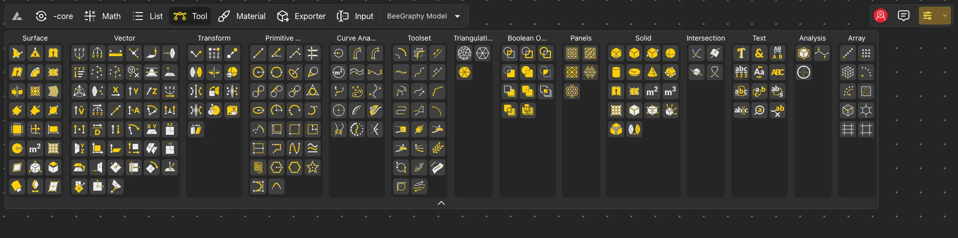 The workspace is designed for interacting with nodes, allowing the creation of 3D parametric models. It offers various functions for workspace management: