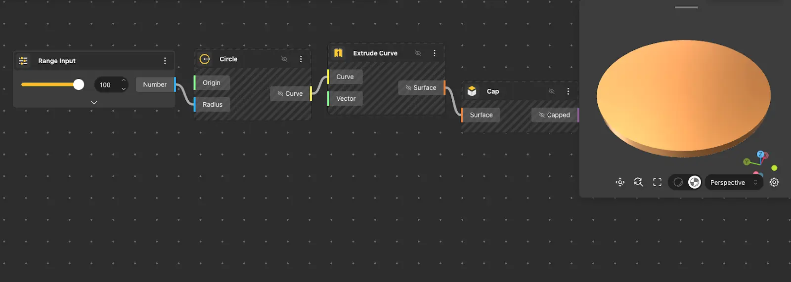 The Circle Surface node returns a circular surface, allowing us to adjust the origin and radius of the surface.