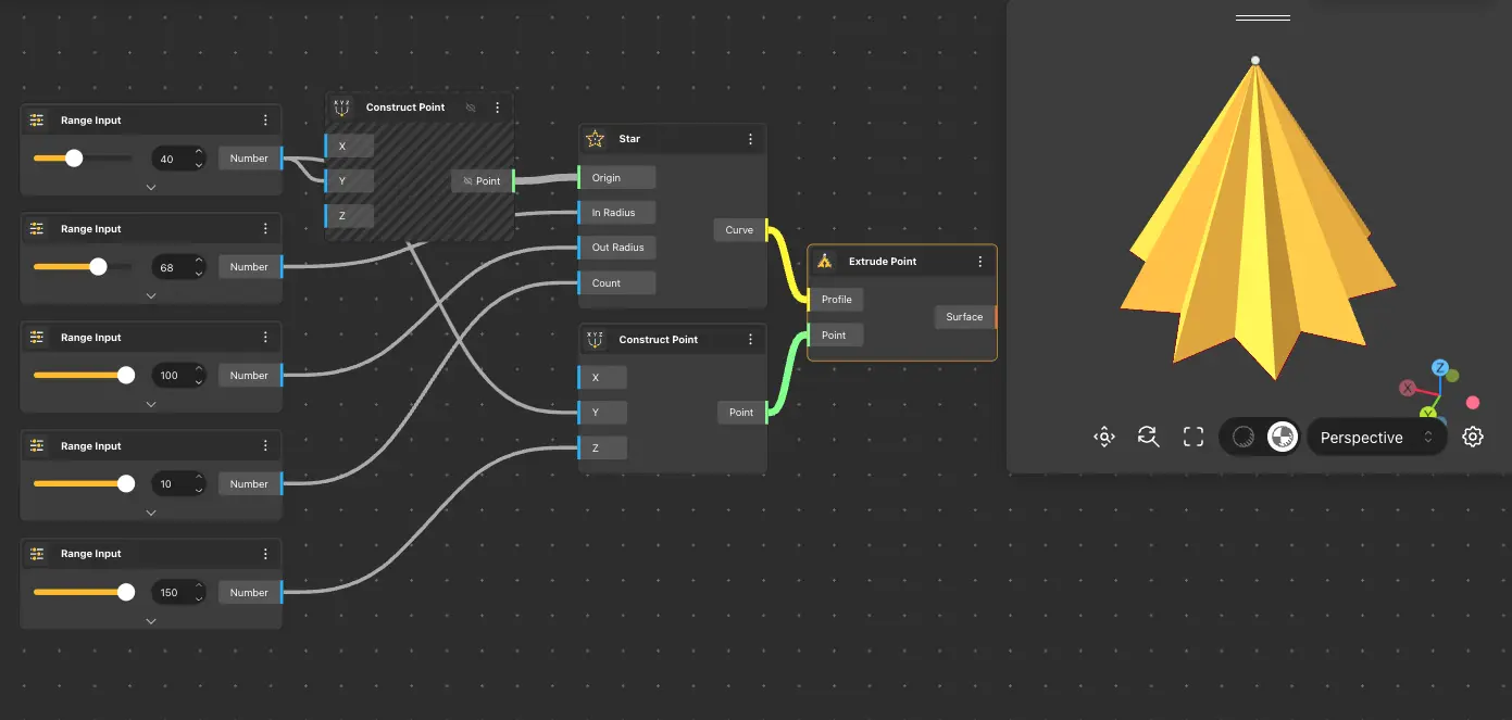 The Extrude Point node extends the curve obtained from the input node towards the specified point.