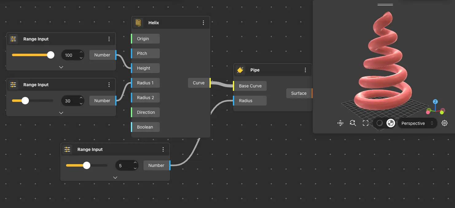 The Pipe node creates a surface with a circular profile around the given curves. With the help of the other port, it is possible to change the radius of the pipe.